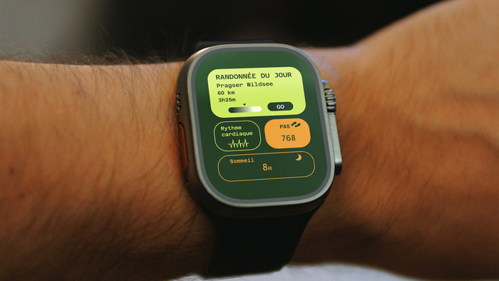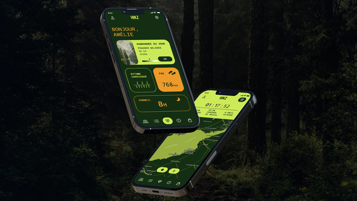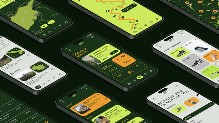 Le mandat du projet était de concevoir une application multiplateforme (montre, mobile et tablette) centrée sur le bien-être et l’activité physique. Cette application visait à suivre les données de santé, mais aussi à donner des conseils personnalisés et des astuces pour adopter des habitudes saines adaptées selon une activité sportive spécifique. Elle était destinée à un large éventail d’utilisateur.rices actif.ves, allant des débutant.es aux athlètes de haut niveau. L’application HIKZ est spécialisée dans le sport de randonnée. L’objectif de l’interface est d’offrir une expérience où l’utilisateur.rice peut non seulement avoir accès à ses données de santé et à l’évolution de sa performance, mais aussi trouver de nouveaux sentiers à parcourir, se créer une liste de souhaits, partager et interagir avec d’autres utilisateur.rices, accéder à une boutique spécialisée, et plus encore. Suite à son inscription, l’utilisateur.rice accède à l’accueil contenant ses données de santé. Il.elle peut aussi accéder à son profil. Les différentes composantes de l’application sont modulaires. La section « bucket list » permet à l’utilisateur.rice de dresser une liste des sentiers ou montagnes qu’il.elle souhaite effectuer. En appuyant sur l’icône « + », il.elle accède à une carte géographique, là où il.elle peut sélectionner l’endroit à ajouter dans la liste. Les utilisateur.rices peuvent échanger entre eux.elles sur les réseaux sociaux en publiant des photos, en mettant un « J’aime » sur les publications des autres. Ils.elles peuvent également clavarder dans un chat et, directement à partir de l’application, faire des achats de vêtements, de chaussures et d’accessoires adaptés pour le hike.
