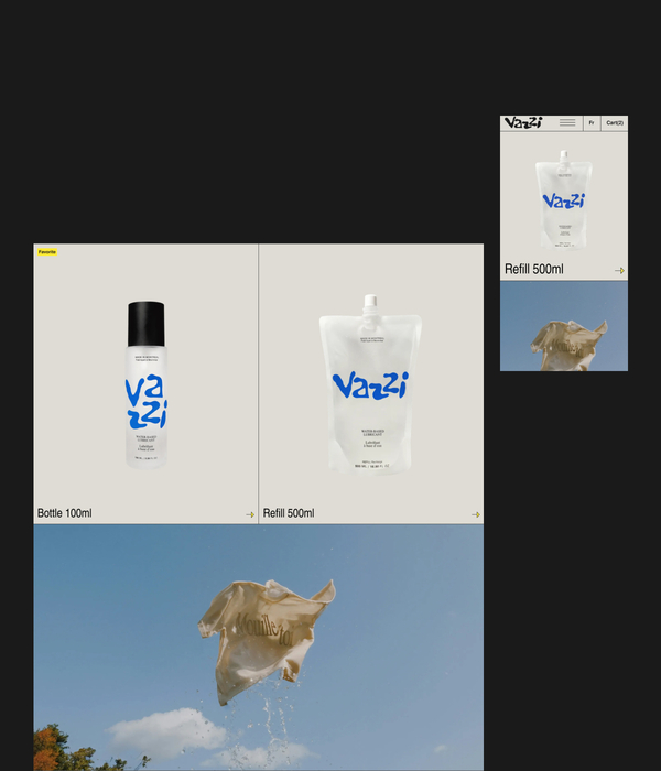 Alors qu’Afterglo met l’accent sur le bien-être et les soins personnels, Vazzi apporte une touche de spontanéité et de fun. Pour refléter cette identité, le site devait être à la fois ludique, fluide et immersif, tout en assurant une navigation intuitive et efficace. Il devait également établir une identité propre à Vazzi tout en restant connecté à la marque mère. Ce projet se distingue par son approche audacieuse et interactive, qui transforme la simple visite d’un site e-commerce en une expérience sensorielle. Loin d’être un site standard, il invite à l’exploration grâce à des animations immersives, un design vibrant et des interactions dynamiques. Le but principal était de traduire de manières visuelle et expérientielle l’identité de Vazzi pour capter l’attention d’un public curieux et ouvert d’esprit. Le site devait stimuler la découverte des produits et favoriser l’engagement, tout en maintenant un parcours d’achat fluide. La plateforme Web se démarque par plusieurs innovations : une immersion dès l’arrivée sur la page d’accueil avec une animation 3D en plein écran de liquide en mouvement ; un univers interactif « Lube-Land » ; ou encore une approche e-commerce simplifiée. Depuis son lancement, Vazzi est rapidement devenu le meilleur vendeur de Afterglo (parmi plus de 250 produits), prouvant l’efficacité de son positionnement et de son site e-commerce. Grâce à ce succès, de nouveaux produits Vazzi, dont un lubrifiant à base de silicone, sont déjà en production pour répondre à la demande croissante.